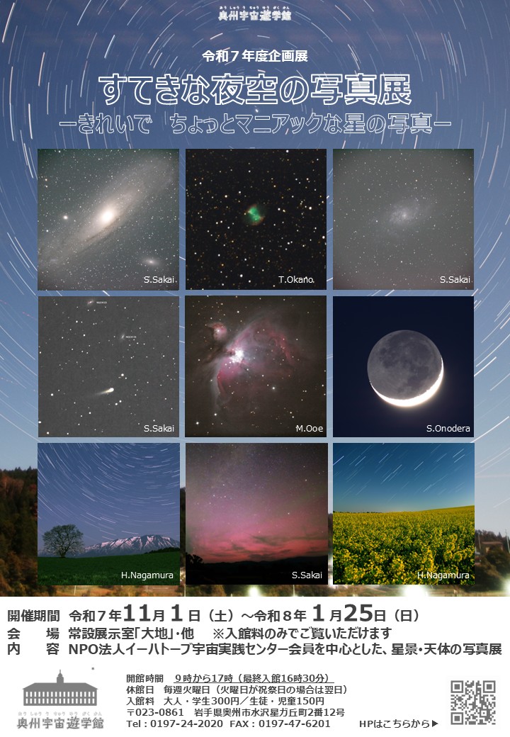 TOP > イベント情報 > 企画展「すてきな夜空の写真展ーきれいで ちょっとマニアックな星の写真ー」 開催期間: 2025年 11月1日 〜 2026年 1月25日開催中! 2025年11月1日(土) 投稿 企画展「すてきな夜空の写真展ーきれいで ちょっとマニアックな星の写真ー」 開催期間 2025年11月1日(土)~2026年1月25日(日)※火曜休館 会 場 奥州宇宙遊学館 常設展示室「大地」 内 容 NPO法人イーハトーブ宇宙実践センター会員を中心とした、星景・天体の写真展 観覧料 入館料のみ (大人・学生300円/生徒・児童150円) 共有: クリックして X で共有 (新しいウィンドウで開きます) X Facebook で共有するにはクリックしてください (新しいウィンドウで開きます) Facebook クリックして Pocket でシェア (新しいウィンドウで開きます) Pocket クリックして友達にメールでリンクを送信 (新しいウィンドウで開きます) メールアドレス クリックして印刷 (新しいウィンドウで開きます) 印刷 その他 クリックして LinkedIn で共有 (新しいウィンドウで開きます) LinkedIn クリックして Tumblr で共有 (新しいウィンドウで開きます) Tumblr クリックして Pinterest で共有 (新しいウィンドウで開きます) Pinterest クリックして Reddit で共有 (新しいウィンドウで開きます) Reddit