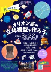 オリオン座は一等星が2つ、二等星が5つもあり、冬の夜空でもひときわ目立つ星座です。しかし本当は、地球から星までの距離はそれぞれ違っていて、宇宙空間に立体に分布しています。オリオン座の立体模型を作って、星々が宇宙空間にどんなふうに広がっているかを学びます。